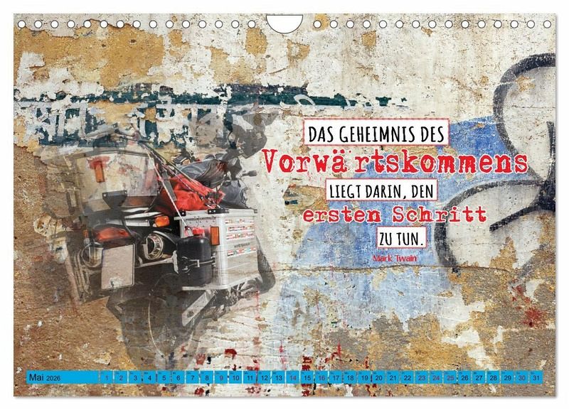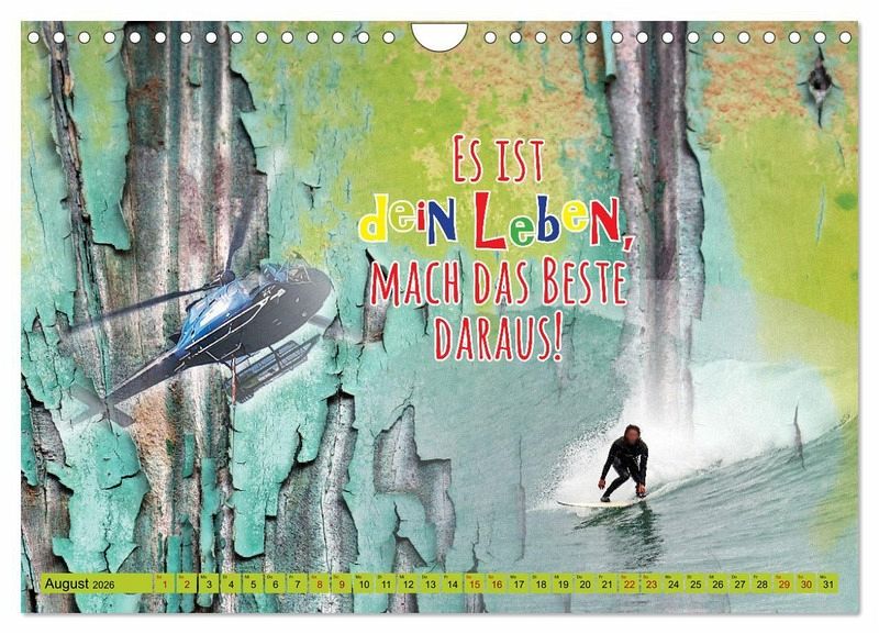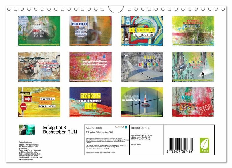 Der moderne und coole Kalender ist Ihr täglicher Begleiter auf dem Weg zu mehr Motivation, Produktivität und Erfolg. Jeder Monat inspiriert Sie mit kraftvollen Zitaten, klugen Impulsen und ermutigenden Worten, die Sie daran erinnern, dass der Schlüssel zum Erfolg im Handeln liegt - im Tun und in der Umsetzung. Lassen Sie sich motivieren, Ihre Träume in die Tat umzusetzen und Ihre Ziele konsequent zu verfolgen. Ob berufliche Ziele, persönliche Projekte oder einfach mehr Zufriedenheit im Alltag, dieser Kalender hilft Ihnen, mit kleinen Schritten große Veränderungen zu bewirken. Lassen Sie sich inspirieren, Ihre Vorsätze in die Tat umzusetzen und machen Sie das Jahr zu Ihrem erfolgreichsten Jahr! Die einzelnen Seiten sind Collagen von Fotografien der Reisefotografin Gabriele Gerner.