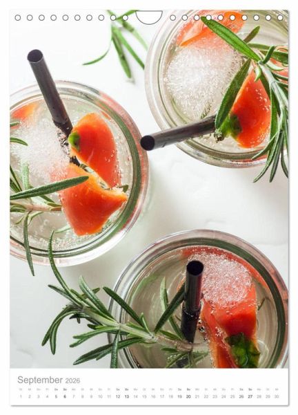Lassen Sie sich erfrischen von leckerem spritzigem Aromawasser mit vitaminreichem Obst und Gemüse. Erdbeeren mit Johannisbeeren, Zitronenlimonade mit Thymian, Paprika mit Rosmarin und vieles mehr. Die Bilder bestechen mit leuchtenden Farben und geben monatliche Ideen für einen gesunden Drink, welche nicht nur das Auge erfreuen, sondern auch mit vielen gesunden Vitaminen locken. Der ideale Kalender für jede Küche.