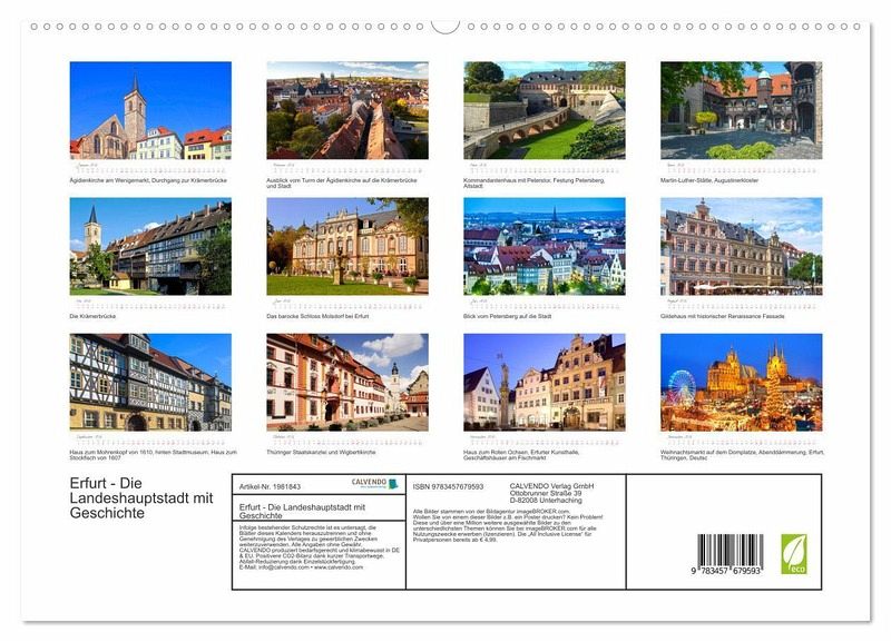 Die thüringische Landeshauptstadt in zwölf stimmungsvollen Bildern. Der Kalender lädt zu einer Stadtführung mit beeindruckenden Sehenswürdigkeiten und historischen Highlights ein.