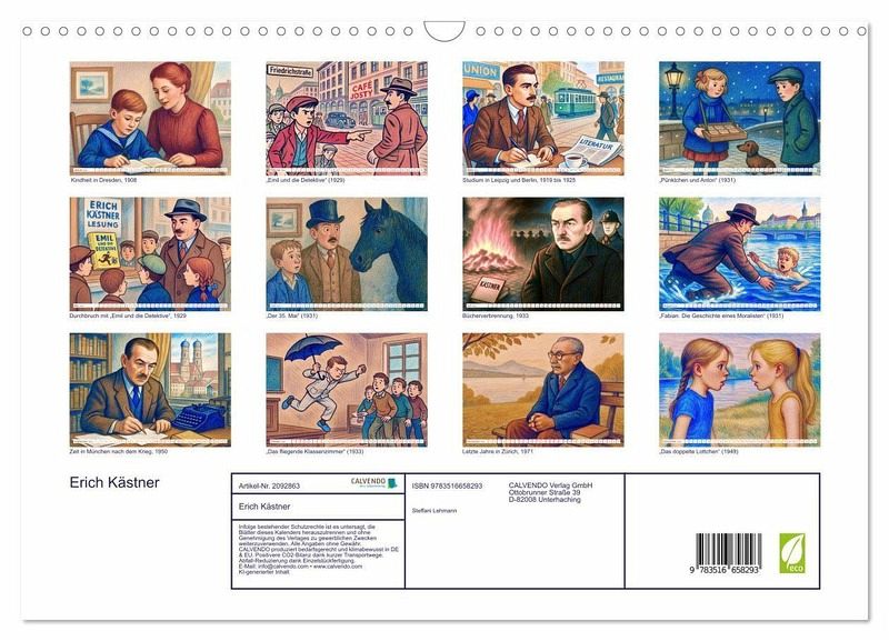 Erich Kästner (1899-1974) war einer der prägenden deutschen Autoren des 20. Jahrhunderts. Mit Klassikern wie "Emil und die Detektive" begeisterte er Generationen von Kindern - und blieb zugleich als Journalist eine kritische Stimme seiner Zeit. Dieser Kalender, dessen Motive Steffani Lehmann mit Unterstützung einer KI editiert hat, zeigt die wichtigsten Stationen seines Lebens und sein literarisches Erbe.