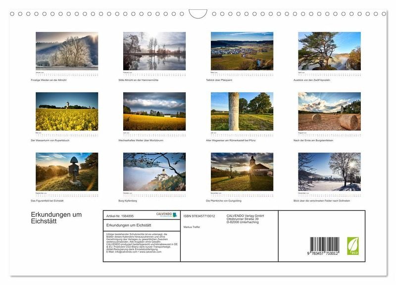 QUALITÄT - Hochwertiger Fotokalender mit 12 wunderschönen Motiven auf lichtbeständigem Bilderdruckpapier, robuste Spiralbindung mit Aufhängebügel.NACHHALTIG - deutliche Abfallreduzierung durch bedarfsgerechte Einzelstückfertigung, umweltfreundliches FSC-zertifiziertes Papier, Produktion in Deutschland, klimabewusste Logistik.PERFEKTES GESCHENK - Kalender für Freunde und Familie, für Kinder und Erwachsene, jung und alt, zu Weihnachten, Geburtstag oder zwischendurch.VIELFALT - Bildkalender in verschiedenen Formaten, z.B. DIN A5, DIN A4, DIN A3 sowie DIN A2. Ob Naturmotiv, Gemälde oder Fotos, ideal für ein persönliches Wohlfühlambiente.Ansichten und Aussichten aus der näheren Umgebung der Stadt Eichstätt im Altmühltal. von Autor(in): Markus Treffer