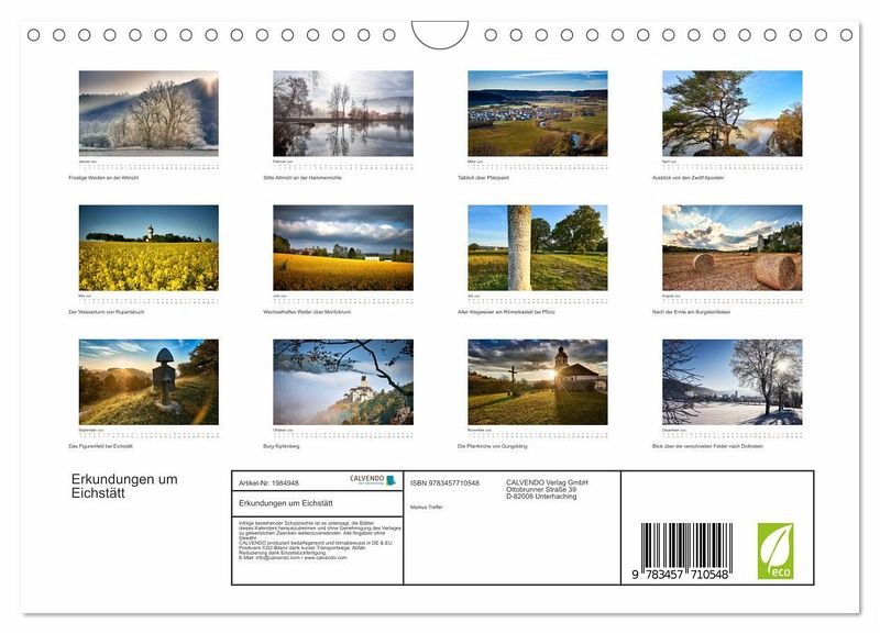 QUALITÄT - Hochwertiger Fotokalender mit 12 wunderschönen Motiven auf lichtbeständigem Bilderdruckpapier, robuste Spiralbindung mit Aufhängebügel.NACHHALTIG - deutliche Abfallreduzierung durch bedarfsgerechte Einzelstückfertigung, umweltfreundliches FSC-zertifiziertes Papier, Produktion in Deutschland, klimabewusste Logistik.PERFEKTES GESCHENK - Kalender für Freunde und Familie, für Kinder und Erwachsene, jung und alt, zu Weihnachten, Geburtstag oder zwischendurch.VIELFALT - Bildkalender in verschiedenen Formaten, z.B. DIN A5, DIN A4, DIN A3 sowie DIN A2. Ob Naturmotiv, Gemälde oder Fotos, ideal für ein persönliches Wohlfühlambiente.Ansichten und Aussichten aus der näheren Umgebung der Stadt Eichstätt im Altmühltal. von Autor(in): Markus Treffer