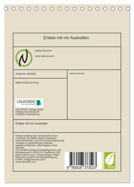 QUALITÄT - Hochwertiger Fotokalender mit 12 wunderschönen Motiven auf lichtbeständigem Bilderdruckpapier, robuste Spiralbindung.NACHHALTIG - deutliche Abfallreduzierung durch bedarfsgerechte Einzelstückfertigung, umweltfreundliches FSC-zertifiziertes Papier, Produktion in Deutschland, klimabewusste Logistik.PERFEKTES GESCHENK - Kalender für Freunde und Familie, für Kinder und Erwachsene, jung und alt, zu Weihnachten, Geburtstag oder zwischendurch.VIELFALT - Bildkalender in verschiedenen Formaten, z.B. DIN A5, DIN A4, DIN A3 sowie DIN A2. Ob Naturmotiv, Gemälde oder Fotos, ideal für ein persönliches Wohlfühlambiente.Australienist einer der beeindruckendsten Kontinente. von Autor(in): Nadine Büscher