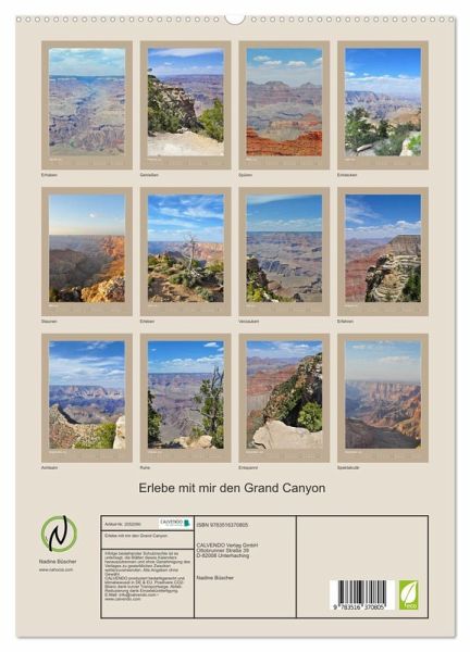 PREMIUM-LINIE - Brillanter Fotokalender mit 12 wunderschönen Motiven, Kunstdruck in Hochglanz in Museumsqualität.QUALITÄT - edle Materialien, stabile Rückwand mit 2 innovativen Einstecktaschen für eine optimale Präsentation an der Wand.NACHHALTIG - deutliche Abfallreduzierung durch bedarfsgerechte Einzelstückfertigung, umweltfreundliches FSC-zertifiziertes Papier, Produktion in Deutschland, klimabewusste Logistik.PERFEKTES GESCHENK - Kalender für Freunde und Familie, für Kinder und Erwachsene, jung und alt, zu Weihnachten, Geburtstag oder zwischendurch.Der Grand Canyon ist eine lange Schlucht im Norden von Arizona. von Autor(in): Nadine Büscher