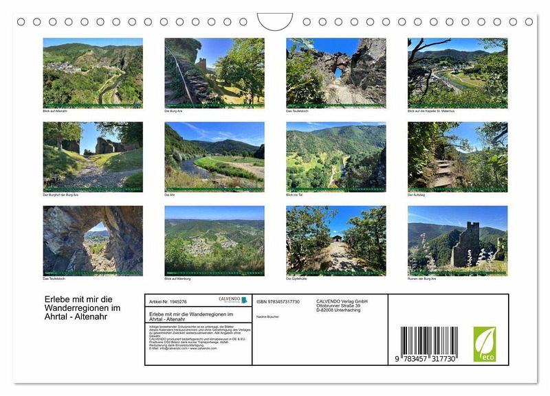 QUALITÄT - Hochwertiger Fotokalender mit 12 wunderschönen Motiven auf lichtbeständigem Bilderdruckpapier, robuste Spiralbindung mit Aufhängebügel.NACHHALTIG - deutliche Abfallreduzierung durch bedarfsgerechte Einzelstückfertigung, umweltfreundliches FSC-zertifiziertes Papier, Produktion in Deutschland, klimabewusste Logistik.PERFEKTES GESCHENK - Kalender für Freunde und Familie, für Kinder und Erwachsene, jung und alt, zu Weihnachten, Geburtstag oder zwischendurch.VIELFALT - Bildkalender in verschiedenen Formaten, z.B. DIN A5, DIN A4, DIN A3 sowie DIN A2. Ob Naturmotiv, Gemälde oder Fotos, ideal für ein persönliches Wohlfühlambiente.Die Region Altenahr bietet tolle Wanderwege mit herrlichen Ausblicken von Autor(in): Nadine Büscher