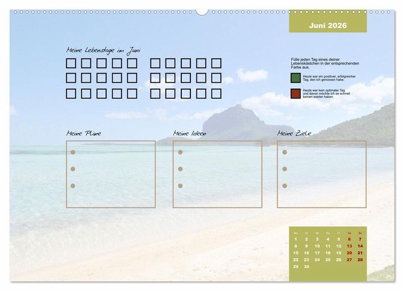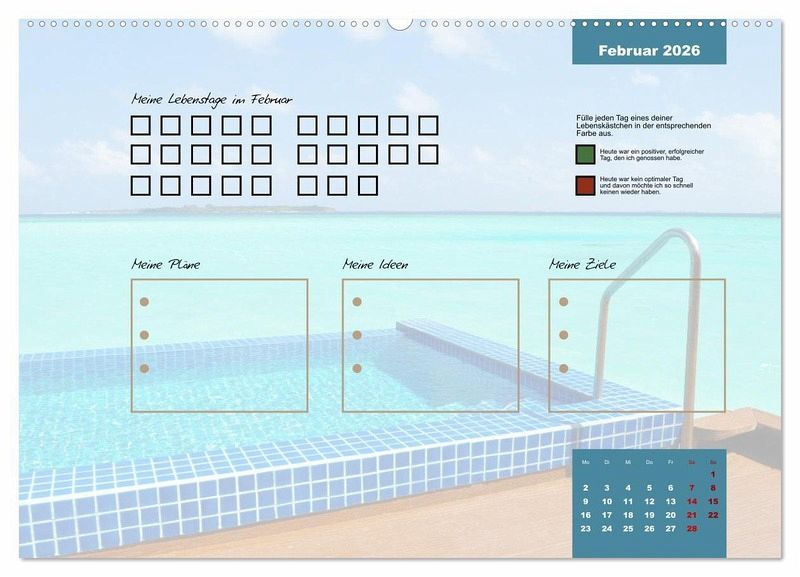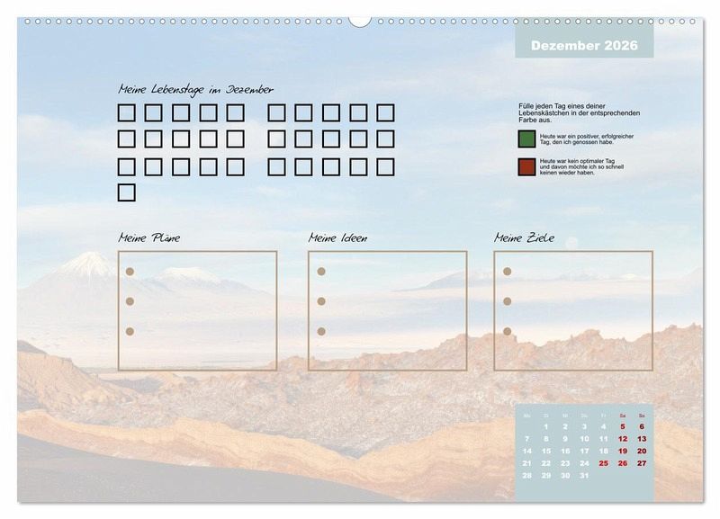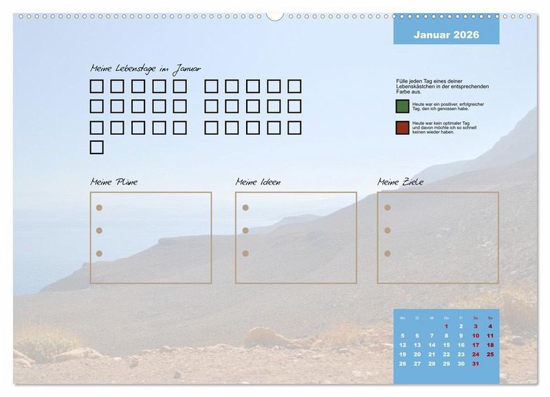 Egal ob es ein guter oder ein schlechter Tag ist, er gehört zu deinem Leben und prägt dich. Erlebe mit diesem Kalender jeden Tag des Jahres bewusster. Fülle jeden Tag ein Kästchen aus. Gerne in unterschiedlichen Farben, um dir die Vergänglichkeit und die Besonderheit jedes einzelnen Tages deutlich zu machen.