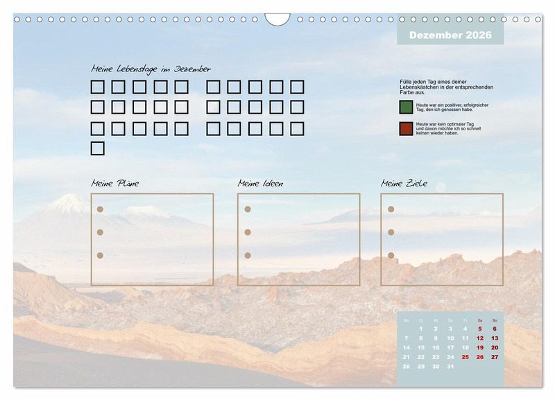 Egal ob es ein guter oder ein schlechter Tag ist, er gehört zu deinem Leben und prägt dich. Erlebe mit diesem Kalender jeden Tag des Jahres bewusster. Fülle jeden Tag ein Kästchen aus. Gerne in unterschiedlichen Farben, um dir die Vergänglichkeit und die Besonderheit jedes einzelnen Tages deutlich zu machen.