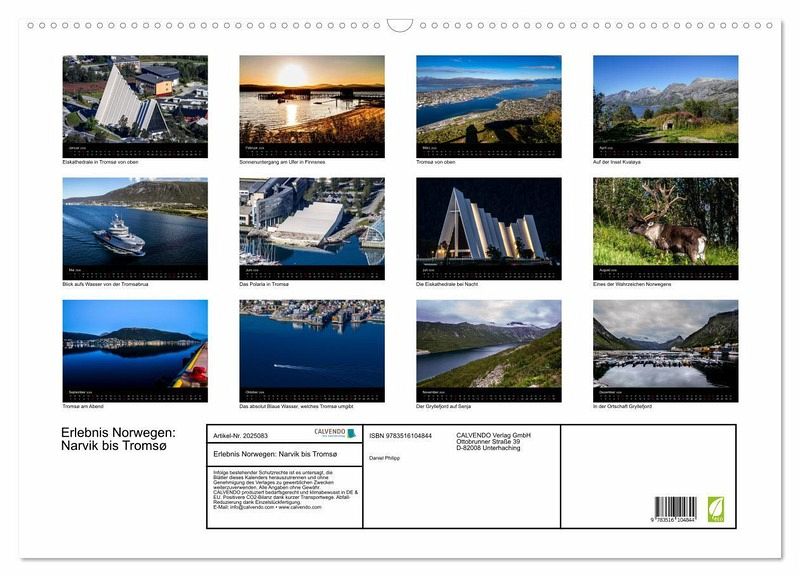 In diesem Kalender finden Sie beeindruckende Fotos aus dem nördliche Norwegen. Spezielles Augenmerk wurde auf den Bereich zwischen Narvik und Tromsø. Bilder von der wunderschönen Landschaft werden hier kombiniert mit schönen Aufnahmen aus Tromsø selbst. Verschiedene Motive, Lichtstimmungen und Wetterlagen machen diesen Kalender zu einem besonderen Werk und einem Muss für Menschen, die von Norwegen begeistert sind.
