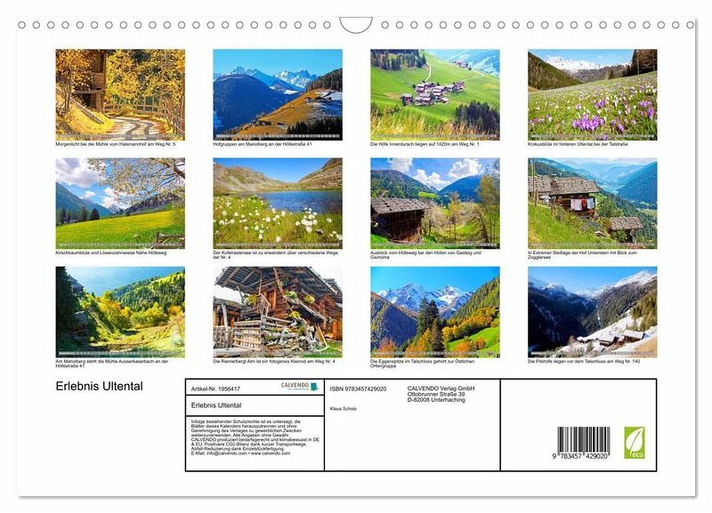 QUALITÄT - Hochwertiger Fotokalender mit 12 wunderschönen Motiven auf lichtbeständigem Bilderdruckpapier, robuste Spiralbindung mit Aufhängebügel.NACHHALTIG - deutliche Abfallreduzierung durch bedarfsgerechte Einzelstückfertigung, umweltfreundliches FSC-zertifiziertes Papier, Produktion in Deutschland, klimabewusste Logistik.PERFEKTES GESCHENK - Kalender für Freunde und Familie, für Kinder und Erwachsene, jung und alt, zu Weihnachten, Geburtstag oder zwischendurch.VIELFALT - Bildkalender in verschiedenen Formaten, z.B. DIN A5, DIN A4, DIN A3 sowie DIN A2. Ob Naturmotiv, Gemälde oder Fotos, ideal für ein persönliches Wohlfühlambiente.Das romantisches Südtiroler Tal abseits vom Touristenstrom von Autor(in): Klaus Scholz