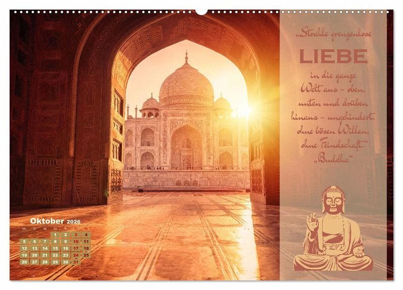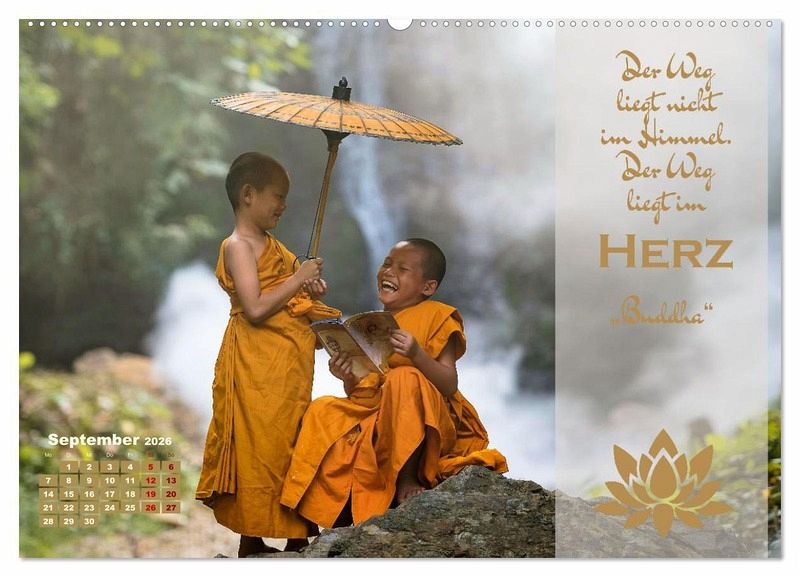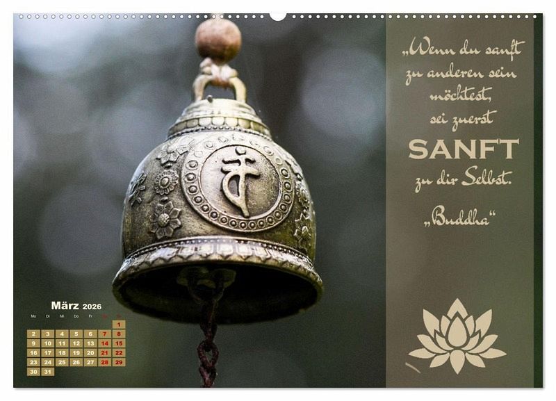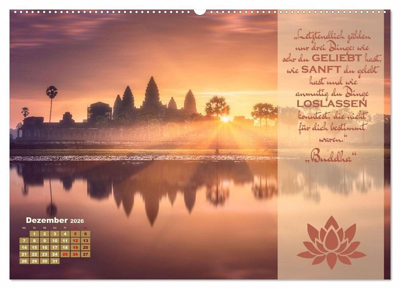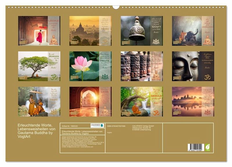 Dieser Kalender enthält 12 schöne Zitate von Buddha und 12 meditative Fotografien. Er eignet wunderbar als Geschenk oder einfach als kleiner Alltagscoach für jede erdenkliche Lebenslagen.