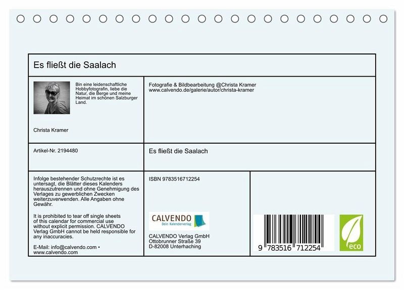QUALITÄT - Hochwertiger Fotokalender mit 12 wunderschönen Motiven auf lichtbeständigem Bilderdruckpapier, robuste Spiralbindung.NACHHALTIG - deutliche Abfallreduzierung durch bedarfsgerechte Einzelstückfertigung, umweltfreundliches FSC-zertifiziertes Papier, Produktion in Deutschland, klimabewusste Logistik.PERFEKTES GESCHENK - Kalender für Freunde und Familie, für Kinder und Erwachsene, jung und alt, zu Weihnachten, Geburtstag oder zwischendurch.VIELFALT - Bildkalender in verschiedenen Formaten, z.B. DIN A5, DIN A4, DIN A3 sowie DIN A2. Ob Naturmotiv, Gemälde oder Fotos, ideal für ein persönliches Wohlfühlambiente.Beeindruckende Impressionen vom Ursprung bis zur Einmündung in die Salzach von Autor(in): Christa Kramer