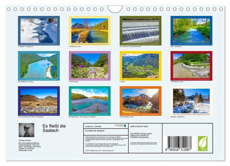 QUALITÄT - Hochwertiger Fotokalender mit 12 wunderschönen Motiven auf lichtbeständigem Bilderdruckpapier, robuste Spiralbindung mit Aufhängebügel.NACHHALTIG - deutliche Abfallreduzierung durch bedarfsgerechte Einzelstückfertigung, umweltfreundliches FSC-zertifiziertes Papier, Produktion in Deutschland, klimabewusste Logistik.PERFEKTES GESCHENK - Kalender für Freunde und Familie, für Kinder und Erwachsene, jung und alt, zu Weihnachten, Geburtstag oder zwischendurch.VIELFALT - Bildkalender in verschiedenen Formaten, z.B. DIN A5, DIN A4, DIN A3 sowie DINA2. Ob Naturmotiv, Gemälde oder Fotos, ideal für ein persönliches Wohlfühlambiente.Beeindruckende Impressionen vom Ursprung bis zur Einmündung in die Salzach von Autor(in): Christa Kramer