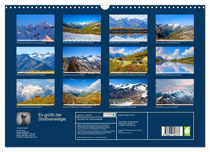 QUALITÄT - Hochwertiger Fotokalender mit 12 wunderschönen Motiven auf lichtbeständigem Bilderdruckpapier, robuste Spiralbindung mit Aufhängebügel.NACHHALTIG - deutliche Abfallreduzierung durch bedarfsgerechte Einzelstückfertigung, umweltfreundliches FSC-zertifiziertes Papier, Produktion in Deutschland, klimabewusste Logistik.PERFEKTES GESCHENK - Kalender für Freunde und Familie, für Kinder und Erwachsene, jung und alt, zu Weihnachten, Geburtstag oder zwischendurch.VIELFALT - Bildkalender in verschiedenen Formaten, z.B. DIN A5, DIN A4, DIN A3 sowie DIN A2. Ob Naturmotiv, Gemälde oder Fotos, ideal für ein persönliches Wohlfühlambiente.Impressionen vom höchsten Berg in der Venedigergruppe und von Salzburg von Autor(in): Christa Kramer