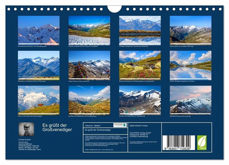 QUALITÄT - Hochwertiger Fotokalender mit 12 wunderschönen Motiven auf lichtbeständigem Bilderdruckpapier, robuste Spiralbindung mit Aufhängebügel.NACHHALTIG - deutliche Abfallreduzierung durch bedarfsgerechte Einzelstückfertigung, umweltfreundliches FSC-zertifiziertes Papier, Produktion in Deutschland, klimabewusste Logistik.PERFEKTES GESCHENK - Kalender für Freunde und Familie, für Kinder und Erwachsene, jung und alt, zu Weihnachten, Geburtstag oder zwischendurch.VIELFALT - Bildkalender in verschiedenen Formaten, z.B. DIN A5, DIN A4, DIN A3 sowie DIN A2. Ob Naturmotiv, Gemälde oder Fotos, ideal für ein persönliches Wohlfühlambiente.Impressionen vom höchsten Berg in der Venedigergruppe und von Salzburg von Autor(in): Christa Kramer