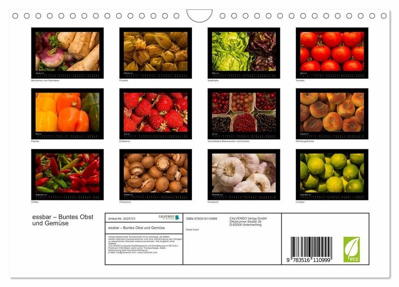 QUALITÄT - Hochwertiger Fotokalender mit 12 wunderschönen Motiven auf lichtbeständigem Bilderdruckpapier, robuste Spiralbindung mit Aufhängebügel.NACHHALTIG - deutliche Abfallreduzierung durch bedarfsgerechte Einzelstückfertigung, umweltfreundliches FSC-zertifiziertes Papier, Produktion in Deutschland, klimabewusste Logistik.PERFEKTES GESCHENK - Kalender für Freunde und Familie, für Kinder und Erwachsene, jung und alt, zu Weihnachten, Geburtstag oder zwischendurch.VIELFALT - Bildkalender in verschiedenen Formaten, z.B. DIN A5, DIN A4, DIN A3 sowie DIN A2. Ob Naturmotiv, Gemälde oder Fotos, ideal für ein persönliches Wohlfühlambiente.Schöne, farbenfrohe Fotografien verschiedener Obst- und Gemüsesorten. Der Kalender, der kulinarisch durchs Jahr führt! von Autor(in): Beates Blickfang