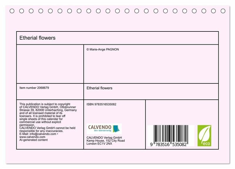 QUALITY - High-quality photo calendar with 12 beautiful images on light-resistant paper, robust spiral binding.SUSTAINABLE - Significant waste reduction due to print-on-demand production, environmentally friendly FSC-certified paper, produced locally, climate-conscious logistical processes.PERFECT GIFT - calendars for friends and family, for children, all ages and all occasions, from Christmas to birthdays and everything in between.LOTS OF CHOICE - Wall calendars in different sizes (DIN A4 and DIN A3), for any topic and personal taste, featuring photography, painting and illustrations.Stunning images featuring ethereal flowers. von Autor(in): Marie-Ange Pagnon