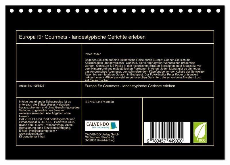Begeben Sie sich auf eine kulinarische Reise durch Europa! Gönnen Sie sich die Köstlichkeiten landestypischer Gerichte, die vor berühmten Wahrzeichen präsentiert werden. Genießen Sie Paella in den historischen Straßen Barcelonas oder Moussaka vor dem Hintergrund des majestätischen Parthenon in Athen. Jeden Monat gibt es ein neues gastronomisches Abenteuer, von schmelzendem Käsefondue vor der Kulisse der Schweizer Alpen bis zum feurigen Gulasch in Budapest. Der Fotokünstler Peter Roder präsentiert gekonnt eine KI-Bilderauswahl an genussvollen Gerichten, die schon beim Ansehen Lust auf Essen machen.