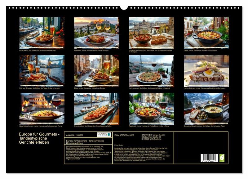 Begeben Sie sich auf eine kulinarische Reise durch Europa! Gönnen Sie sich die Köstlichkeiten landestypischer Gerichte, die vor berühmten Wahrzeichen präsentiert werden. Genießen Sie Paella in den historischen Straßen Barcelonas oder Moussaka vor dem Hintergrund des majestätischen Parthenon in Athen. Jeden Monat gibt es ein neues gastronomisches Abenteuer, von schmelzendem Käsefondue vor der Kulisse der Schweizer Alpen bis zum feurigen Gulasch in Budapest. Der Fotokünstler Peter Roder präsentiert gekonnt eine KI-Bilderauswahl an genussvollen Gerichten, die schon beim Ansehen Lust auf Essen machen.