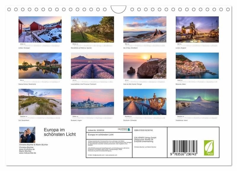 Lassen Sie sich verzaubern vom eiskalten Norden Skandinaviens, von der farbenfrohen Lavendelblüte Frankreichs, vom ländlichen Charme Hollands oder vom prachtvollen Flair verschiedener europäischer Metropolen. Unser Kontinent hat so viel zu bieten. Dieser Kalender wird Sie mit 12 stimmungsvollen Aufnahmen durchs kommende Jahr begleiten.