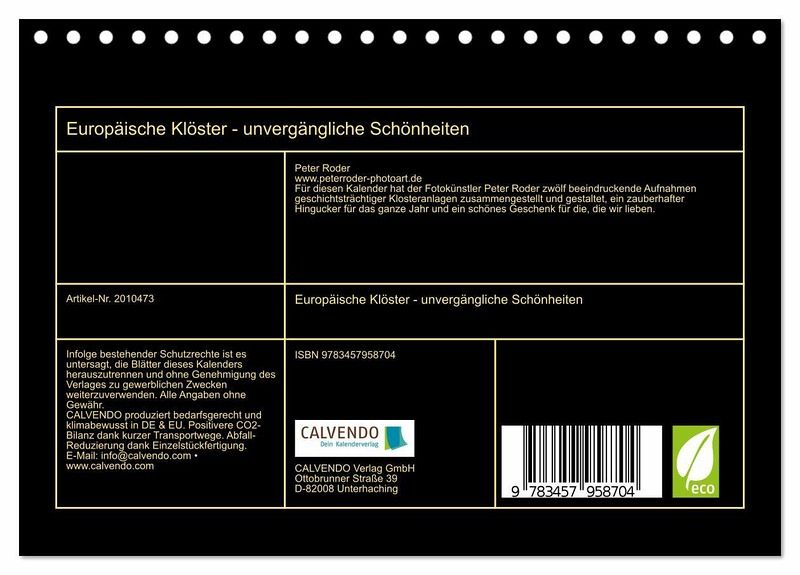 Für diesen Kalender hat der Fotokünstler Peter Roder zwölf beeindruckende Aufnahmen geschichtsträchtiger Klosteranlagen zusammengestellt und gestaltet, ein zauberhafter Hingucker für das ganze Jahr und ein schönes Geschenk für die, die wir lieben.