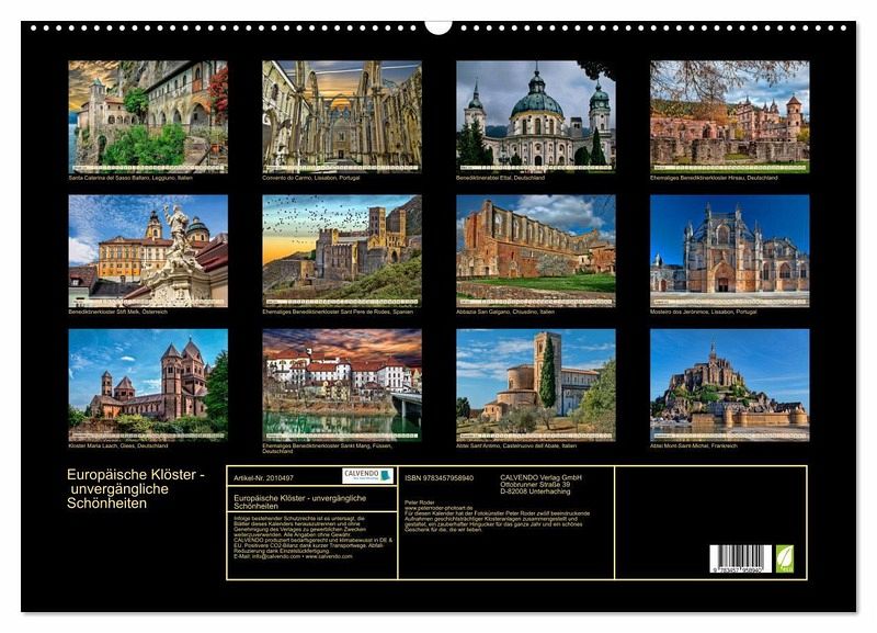 Für diesen Kalender hat der Fotokünstler Peter Roder zwölf beeindruckende Aufnahmen geschichtsträchtiger Klosteranlagen zusammengestellt und gestaltet, ein zauberhafter Hingucker für das ganze Jahr und ein schönes Geschenk für die, die wir lieben.