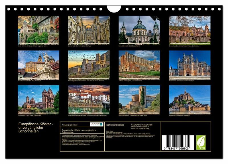 Für diesen Kalender hat der Fotokünstler Peter Roder zwölf beeindruckende Aufnahmen geschichtsträchtiger Klosteranlagen zusammengestellt und gestaltet, ein zauberhafter Hingucker für das ganze Jahr und ein schönes Geschenk für die, die wir lieben.
