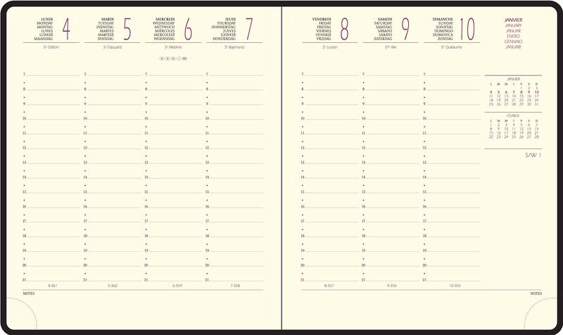 Kalender Eurotime 18, Barbara, auswechselbar, Kalender gebunden, 15x17 cm, Wochenplaner, Januar bis Dezember Einband aus glattem Kunstleder. 1 Woche auf 2 Seiten mit senkrechter Wochenanordnung. 07:00-21:00 Uhr. Elfenbeinfarbenes Clairefontaine-Papier, das für seine Qualität bekannt ist. Abtrennbare Ecken, um schnell auf die aktuelle Woche zugreifen zu können. 6-sprachig, von 7.00 Uhr bis 21.00 Uhr. Praktische Infos, ein herausnehmbares, Telefonverzeichnis, das man leicht verschieben und im nächsten Jahr in seinem neuen Kalender aufbewahren kann. Zertifizierungen: PEFC (Papierfasern aus nachhaltig bewirtschafteten Wäldern) - Imprim'vert (umweltfreundlicher Druck).