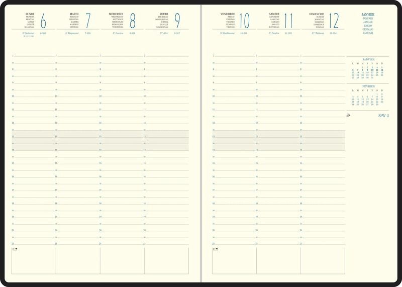 Jahreskalender, Eurotime 29 Volga, gebunden, auswechselbar, A4, 12 Monate 1 Woche komplett auf 2 Seiten. 12 Monate: Januar bis Dezember. Elfenbeinfarbenes Papier. Von 7.00 Uhr bis 21.00 Uhr. Halbstündliches Raster. Mit Fadenbindung. Wissenswerte Informationen. Fünfsprachige Ausgabe: Französisch - Englisch - Deutsch - Niederländisch - It alienisch. 2-farbiger Druck blau/grau. Lederartig mit Sattlernaht.