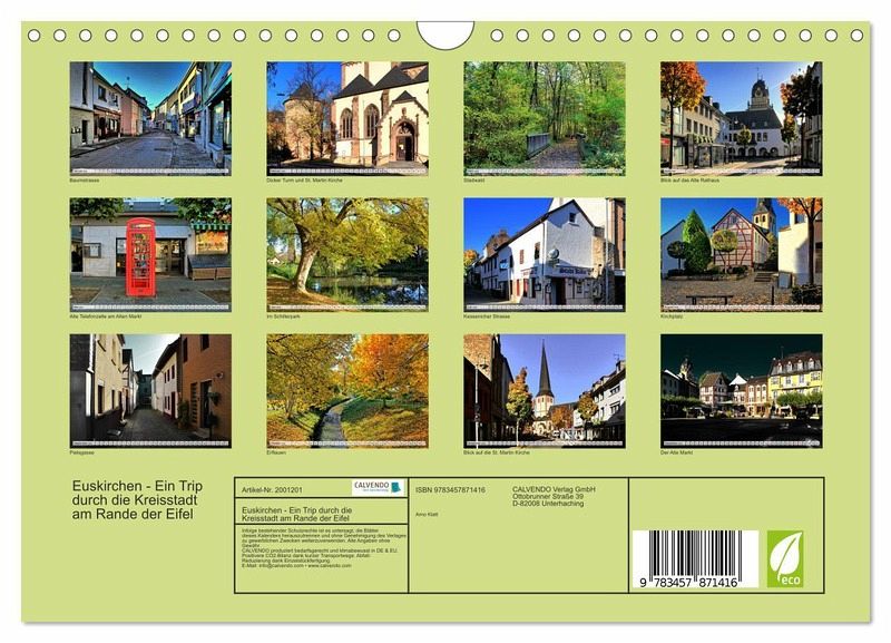 QUALITÄT - Hochwertiger Fotokalender mit 12 wunderschönen Motiven auf lichtbeständigem Bilderdruckpapier, robuste Spiralbindung mit Aufhängebügel.NACHHALTIG - deutliche Abfallreduzierung durch bedarfsgerechte Einzelstückfertigung, umweltfreundliches FSC-zertifiziertes Papier, Produktion in Deutschland, klimabewusste Logistik.PERFEKTES GESCHENK - Kalender für Freunde und Familie, für Kinder und Erwachsene, jung und alt, zu Weihnachten, Geburtstag oder zwischendurch.VIELFALT - Bildkalender in verschiedenen Formaten, z.B. DIN A5, DIN A4, DIN A3 sowie DIN A2. Ob Naturmotiv, Gemälde oder Fotos, ideal für ein persönliches Wohlfühlambiente.Die Kreisstadt Euskirchen in Bildern festgehalten von Autor(in): Arno Klatt