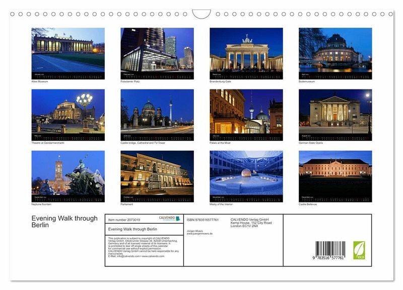 QUALITY - High-quality photo calendar with 12 beautiful images on light-resistant paper, robust spiral binding with hanger.SUSTAINABLE - Significant waste reduction due to print-on-demand production, environmentally friendly FSC-certified paper, produced in the UK, climate-conscious logistical processes.PERFECT GIFT - calendars for friends and family, for children, all ages and all occasions, from Christmas to birthdays and everything in between.LOTS OF CHOICE - Wall calendars in different sizes (DIN A4 and DIN A3), for any topic and personal taste, featuring photography, painting and illustrations.Berlin at Night, author: Jürgen Moers