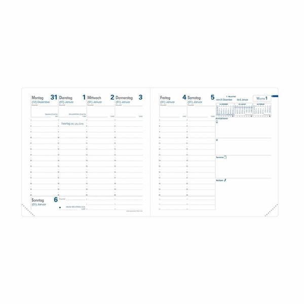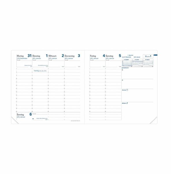 Quo Vadis - Terminkalender - 2026 - Executif - Die Woche Planning - Deutsch - Club - Hellblau - Dez/Dez - 16x16 cm - Clairefontaine-Papier Weiß - Hergestellt in Frankreich Wochenkalender mit einer doppelseitigen Übersicht Wochenübersicht - die ganze Woche auf einen Blick Enthält auf jeder Doppelseite einen freien Bereich zum Notieren wichtiger Informationen (zu kontaktierende Personen, zu erledigende Dinge usw.) Papier Clairefontaine, weiß, für ein glattes und flüssiges Schreibgefühl, perforierte abreißbare Ecken für eine einfache Orientierung Abnehmbarer Deckel und nachfüllbarer Inhalt für eine lange Verwendung Aufbewahrungstaschen für kleine Dokumente und ein herausnehmbares Verzeichnis für Ihre Kontakte