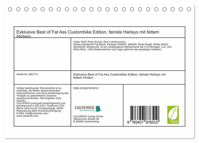 QUALITÄT - Hochwertiger Fotokalender mit 12 wunderschönen Motiven auf lichtbeständigem Bilderdruckpapier, robuste Spiralbindung.NACHHALTIG - deutliche Abfallreduzierung durch bedarfsgerechte Einzelstückfertigung, umweltfreundliches FSC-zertifiziertes Papier, Produktion in Deutschland, klimabewusste Logistik.PERFEKTES GESCHENK - Kalender für Freunde und Familie, für Kinder und Erwachsene, jung und alt, zu Weihnachten, Geburtstag oder zwischendurch.VIELFALT - Bildkalender in verschiedenen Formaten, z.B. DIN A5, DIN A4, DIN A3 sowie DIN A2. Ob Naturmotiv, Gemälde oder Fotos, ideal für ein persönliches Wohlfühlambiente.Exklusiver Best of Custombike Kalender mit der Fat Ass Edition einiger der wohl schönsten Harley-Davidson Umbauten von Autor(in): Volker Wolf