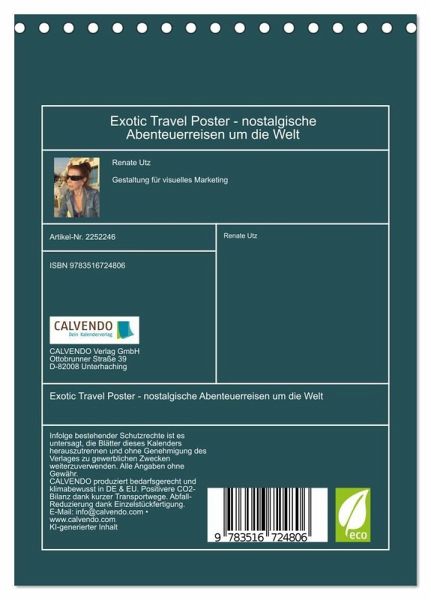 QUALITÄT - Hochwertiger Fotokalender mit 12 wunderschönen Motiven auf lichtbeständigem Bilderdruckpapier, robuste Spiralbindung.NACHHALTIG - deutliche Abfallreduzierung durch bedarfsgerechte Einzelstückfertigung, umweltfreundliches FSC-zertifiziertes Papier, Produktion in Deutschland, klimabewusste Logistik.PERFEKTES GESCHENK - Kalender für Freunde und Familie, für Kinder und Erwachsene, jung und alt, zu Weihnachten, Geburtstag oder zwischendurch.VIELFALT - Bildkalender in verschiedenen Formaten, z.B. DIN A5, DIN A4, DIN A3 sowie DIN A2. Ob Naturmotiv, Gemälde oder Fotos, ideal für ein persönliches Wohlfühlambiente.Kunstvolle Neuinterpretationen historischer Reiseplakate im Vintage-Stil von Autor(in): Renate Bleicher