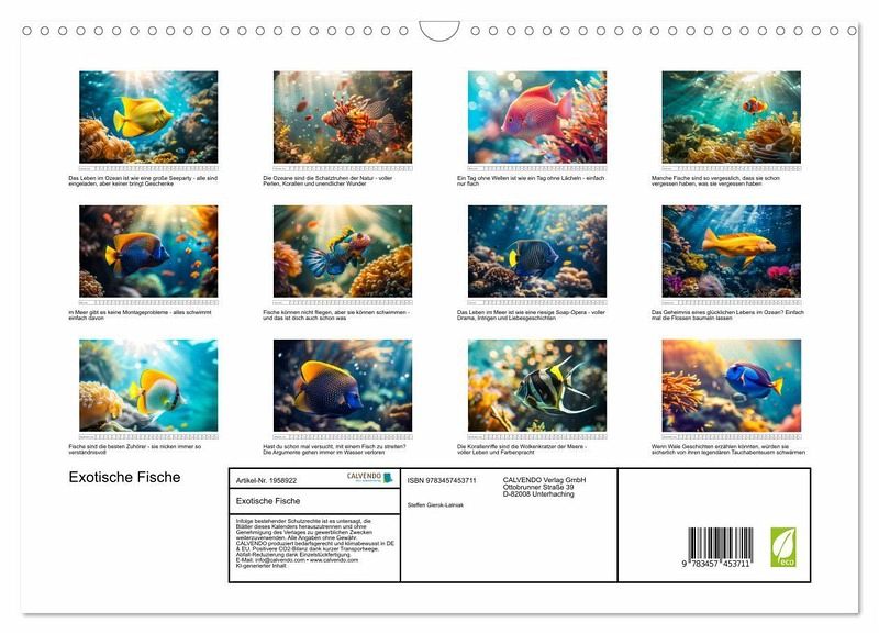 QUALITÄT - Hochwertiger Fotokalender mit 12 wunderschönen Motiven auf lichtbeständigem Bilderdruckpapier, robuste Spiralbindung mit Aufhängebügel.NACHHALTIG - deutliche Abfallreduzierung durch bedarfsgerechte Einzelstückfertigung, umweltfreundliches FSC-zertifiziertes Papier, Produktion in Deutschland, klimabewusste Logistik.PERFEKTES GESCHENK - Kalender für Freunde und Familie, für Kinder und Erwachsene, jung und alt, zu Weihnachten, Geburtstag oder zwischendurch.VIELFALT - Bildkalender in verschiedenen Formaten, z.B. DIN A5, DIN A4, DIN A3 sowie DIN A2. Ob Naturmotiv, Gemälde oder Fotos, ideal für ein persönliches Wohlfühlambiente.Tauchen Sie ein in die faszinierende Welt exotischer Fische, wo Farben explodieren und Formen verzaubern. von Autor(in): Steffen Gierok ; Magik Artist Design