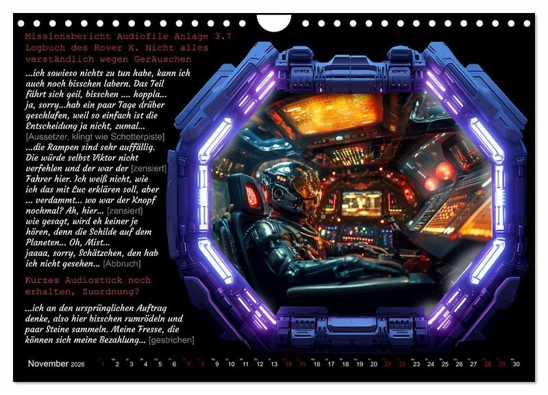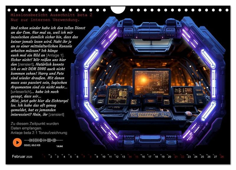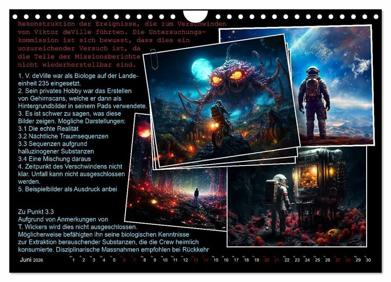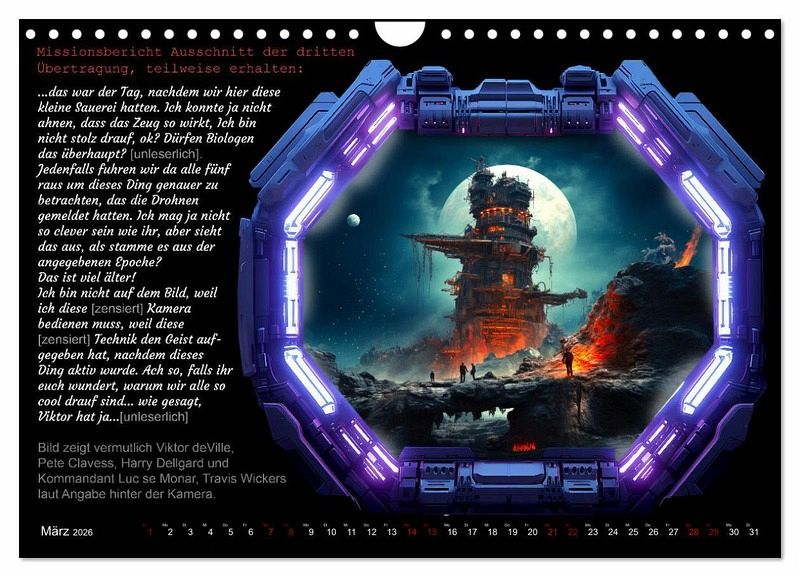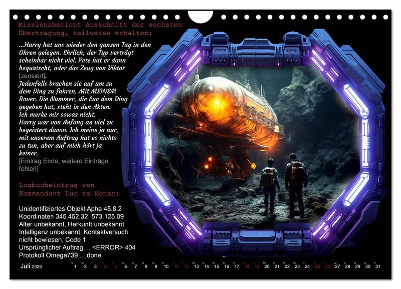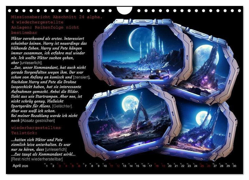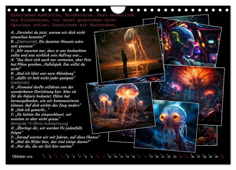 Willkommen zu meinem SF-Rätsel-Geschichten-Kalender. Die Bilder sind Teil des Rätsels, teilweise erklären sie den Text, teilweise geben sie weitere Informationen. Da muss man manchmal auf Kleinigkeiten achten. Und manchmal ist das Bild gar nicht wichtig. Vertrackt! Rätsel haben immer ein Problem - sie sind entweder zu schwer oder zu leicht. In dieser Geschichte sind mehrere Ebenen versteckt, so dass, so hoffe ich, jeder etwas davon hat, unabhängig davon, ob derjenige die Geschichte lösen konnte oder nicht. Natürlich haben die zwölf Monate zusammen als Geschichte eine Lösung. Die ist aber sehr knifflig, das gebe ich zu. Also eher für Science Fiction Profis, die nicht so schnell aufgeben wollen und sich herausgefordert fühlen wollen. Zudem gibt es keine EINZIGE Lösung, es ist also durchaus frei in der Interpretation. Jeder Monat für sich kann auch eine eigene Geschichte sein, die man weiter ausbauen kann und eine persönliche Science Fiction Geschichte daraus formen kann. Als Inspiration für die Leser, die gern selbst Geschichten erfinden wollen.Die Science Fiction Geschichte ist also im wahrsten Sinne des Wortes eine Sammlung loser Informationsschnipsel, nicht jedes davon hat eine Bedeutung - wie das so ist bei gefundenen Schnipseln. Andere wiederum haben eine wichtige Bedeutung, die nicht jeder erkennt. Und natürlich gibt es falsche Fährten... Viel Freude beim Gehirn anstrengen. Kerstin WaurickDie Bilder sind entstanden in Midjourney, die Geschichte ist entstanden in meiner eigenen Fantasie. Als Science Fiction Fan liebe ich anspruchsvolle Geschichten mit origineller Lösung und hoffe, mit dieser ist mir eine gelungen.