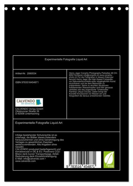 QUALITÄT - Hochwertiger Fotokalender mit 12 wunderschönen Motiven auf lichtbeständigem Bilderdruckpapier, robuste Spiralbindung.NACHHALTIG - deutliche Abfallreduzierung durch bedarfsgerechte Einzelstückfertigung, umweltfreundliches FSC-zertifiziertes Papier, Produktion in Deutschland, klimabewusste Logistik.PERFEKTES GESCHENK - Kalender für Freunde und Familie, für Kinder und Erwachsene, jung und alt, zu Weihnachten, Geburtstag oder zwischendurch.VIELFALT - Bildkalender in verschiedenen Formaten, z.B. DIN A5, DIN A4, DIN A3 sowie DIN A2. Ob Naturmotiv, Gemälde oder Fotos, ideal für ein persönliches Wohlfühlambiente.Faszinierende High-Speed Experimental-Fotografien rund um das Thema Wasser begeistern Sie monatlich während des ganzen Jahres. von Autor(in): Henry Jager