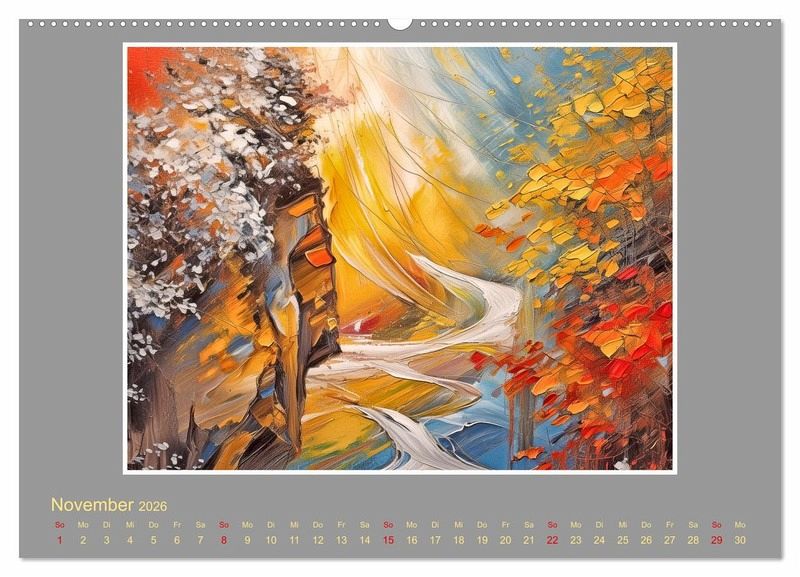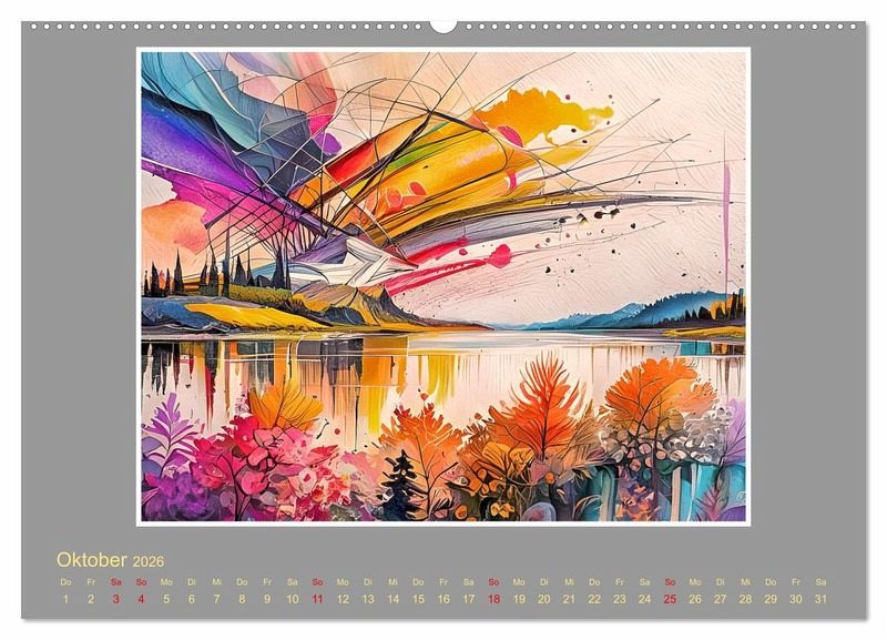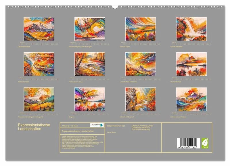 Expressionistische Landschaften zeichnen sich durch ihre subjektive und stark emotionale Darstellung der Natur aus. Die Landschaft wird oft verzerrt, mit kräftigen Farben und dynamischen Pinselstrichen dargestellt, um die inneren Empfindungen und Stimmungen des Künstlers widerzuspiegeln. Bekannte Vertreter expressionistischer Landschaftsmalerei waren zum Beispiel Ernst Ludwig Kirchner oder Emil Nolde. Für diesen Kalender wurde jedoch eine künstliche Intelligenz eingesetzt, um gemalt wirkende Landschaftsbilder in diesem Sinn zu erstellen. Daher können Sie jeden Monat an Ihrer Wand die Stimmung eines einzigartigen Naturerlebnisses nachvollziehen.