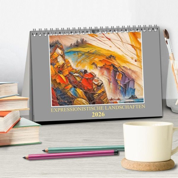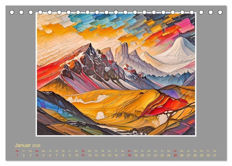 Expressionistische Landschaften zeichnen sich durch ihre subjektive und stark emotionale Darstellung der Natur aus. Die Landschaft wird oft verzerrt, mit kräftigen Farben und dynamischen Pinselstrichen dargestellt, um die inneren Empfindungen und Stimmungen des Künstlers widerzuspiegeln. Bekannte Vertreter expressionistischer Landschaftsmalerei waren zum Beispiel Ernst Ludwig Kirchner oder Emil Nolde. Für diesen Kalender wurde jedoch eine künstliche Intelligenz eingesetzt, um gemalt wirkende Landschaftsbilder in diesem Sinn zu erstellen. Daher können Sie jeden Monat an Ihrer Wand die Stimmung eines einzigartigen Naturerlebnisses nachvollziehen.