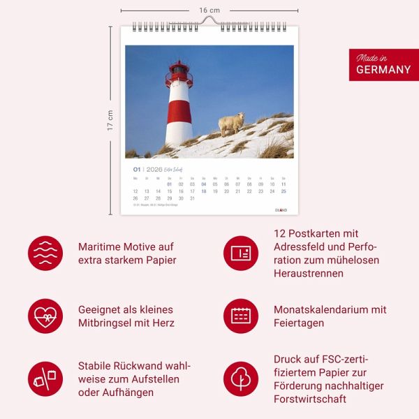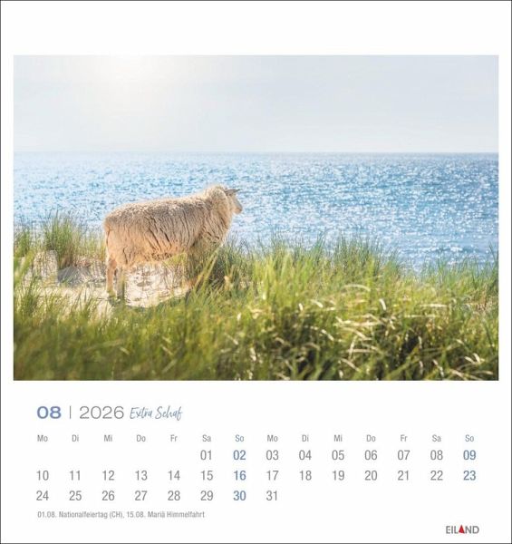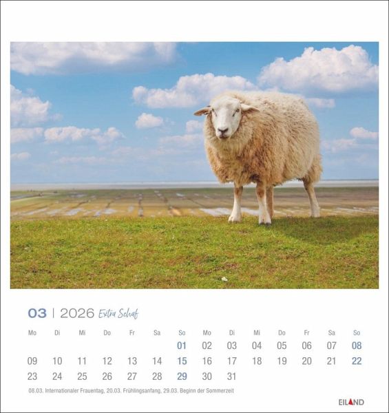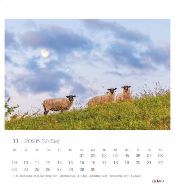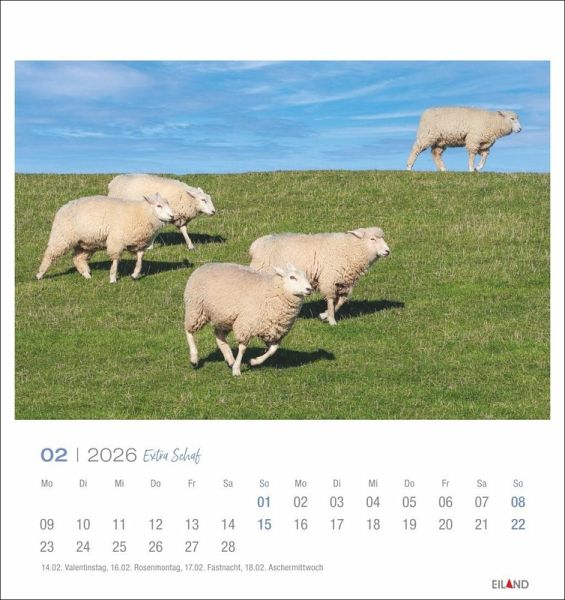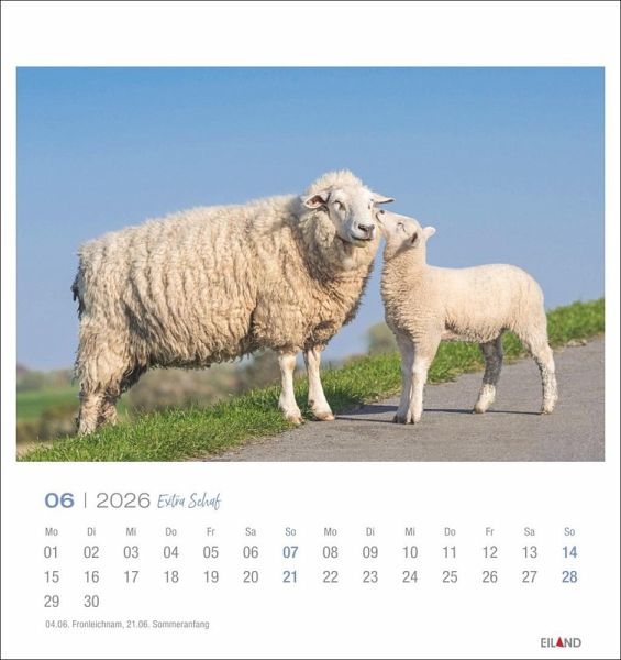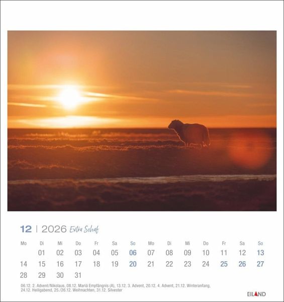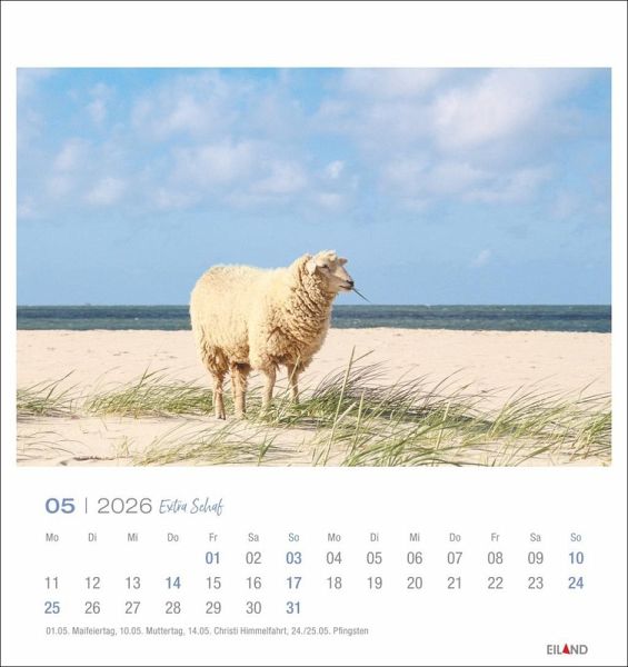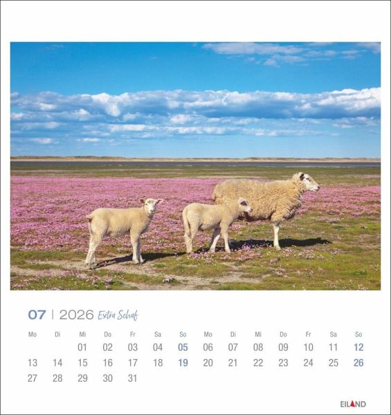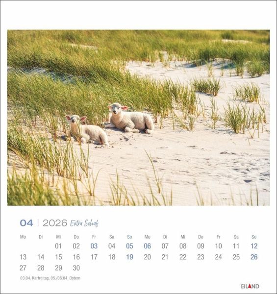 - Macht tierisch glücklich: Monatskalender 2026 mit flauschigen Schafen zum Verlieben- Kalender im Postkartenformat 16 x 17 cm mit süßen Lämmern und Co.- Die Landpartie für zu Hause: Fotokalender mit 12 atmosphärischen Tierfotos in reizvoller Landschaft- Sonne, Strand und Wolle: niedliche Lämmchen in einem kleinen Kalender mit Postkarten zum Versenden oder Sammeln- Viele weitere Themen als Kalender von Eiland im Athesia Kalenderverlag