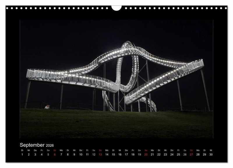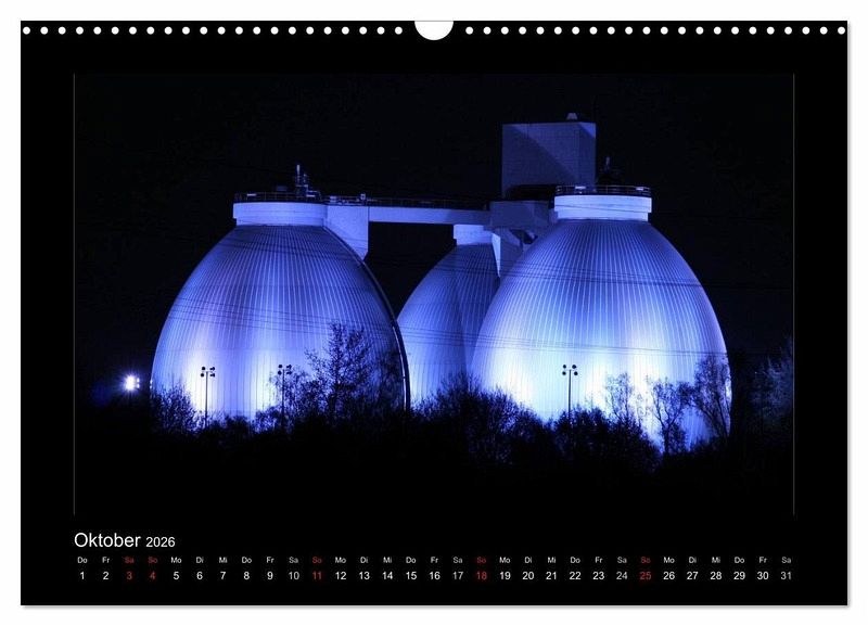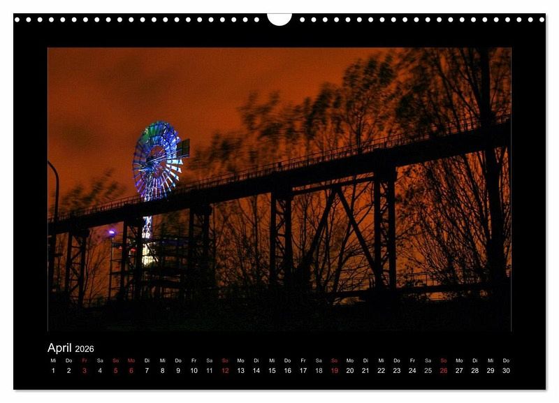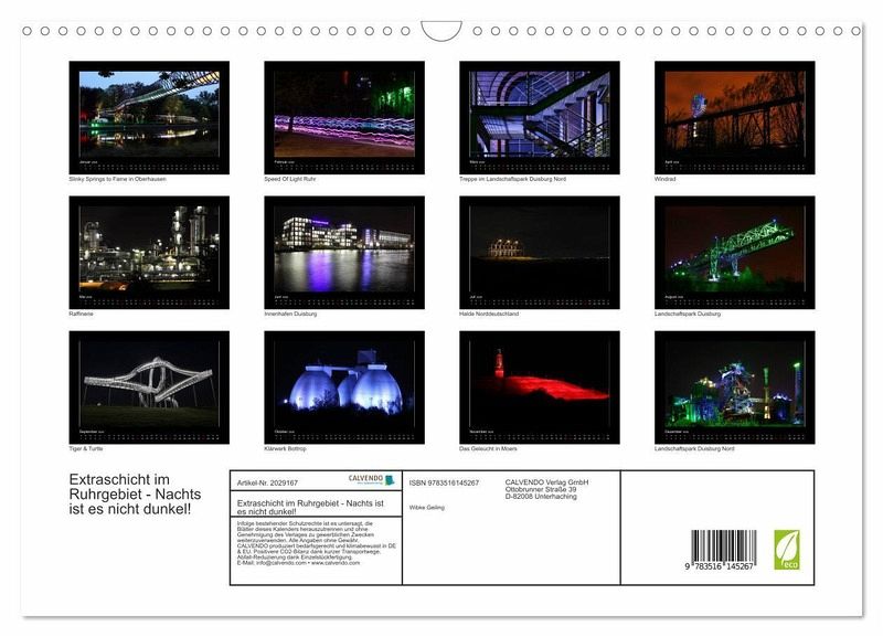 Das Ruhrgebiet ist in der Nacht bunt und hell beleuchtet. Tauchen Sie ein in die bunte und schillernde Welt des Ruhrgebiets. Orte wie der Innenhafen in Duisburg, Tiger & Turtle, das Geleucht in Moers, Slinky Springs to Fame in Oberhausen, die Halde Norddeutschland, das Klärwerk in Bottrop mit seinen blauen Eiern oder das Windrad im feuerroten Himmel. Dieser Kalender wird Ihre Wand verzaubern.