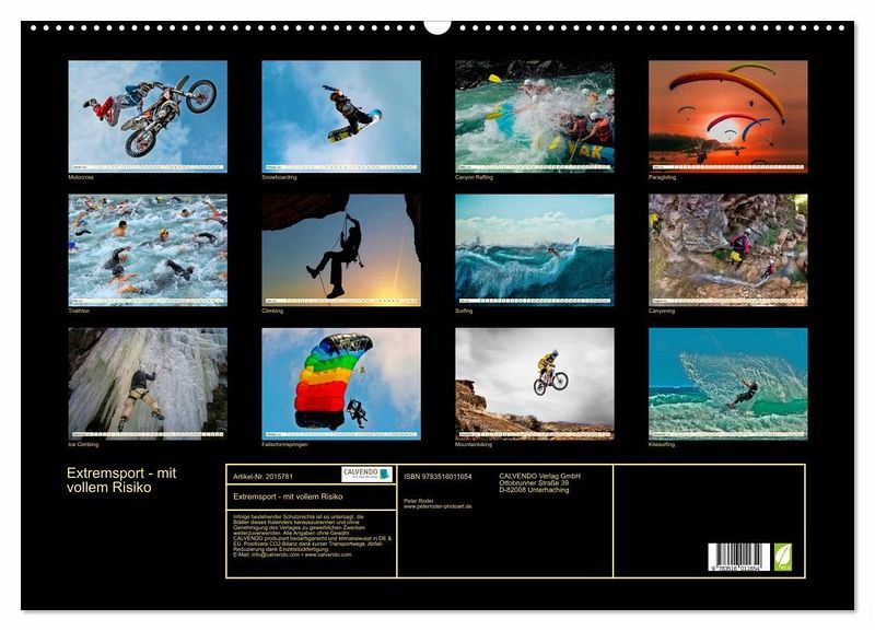 Extremsport, das bedeutet Geschicklichkeit, Kondition, Schnelligkeit und vor allem auch Mut. Extremsportarten haben sich in den letzten Jahren explosionsartig verbreitet, viele Sportler suchen nach extremen Erlebnissen, nach außergewöhnlichen Erfahrungen und Emotionen. Die Athleten wollen die eigenen Leistungsgrenzen austesten und suchen eine Antwort auf die Frage: " Was kann ich meinem Körper zumuten. Wo stößt der Körper an seine Grenzen?" Dabei bedeutet Extremsport für den Sportler eine enorme physische und psychische Herausforderung und ist mit großem Risiko verbunden. Was letztendlich jedoch allem übergeordnet wird, ist die Suche nach dem Adrenalin-Kick, dem Nervenkitzel und der Sensation. Der Fotokünstler Peter Roder hat beeindruckende Bilder aus zwölf Extremsportarten zusammengestellt und gestaltet, ein eindrucksvoller Begleiter für das ganze Jahr.