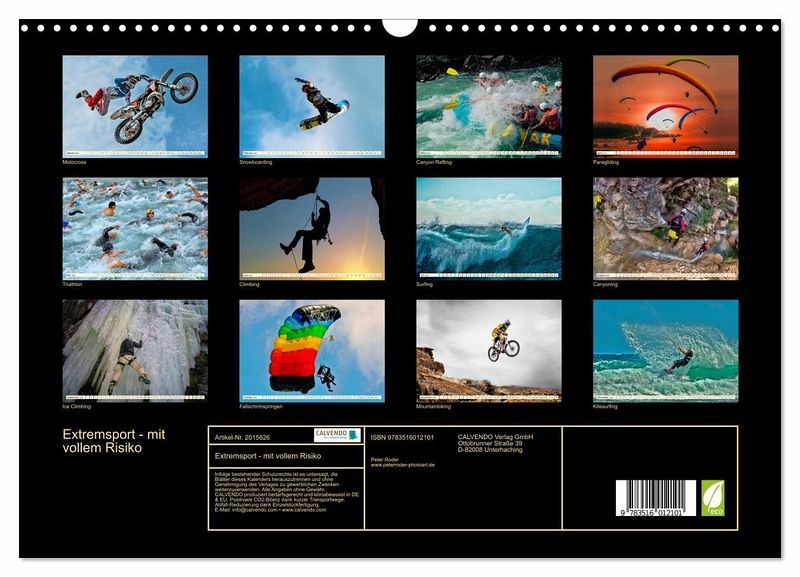 Extremsport, das bedeutet Geschicklichkeit, Kondition, Schnelligkeit und vor allem auch Mut. Extremsportarten haben sich in den letzten Jahren explosionsartig verbreitet, viele Sportler suchen nach extremen Erlebnissen, nach außergewöhnlichen Erfahrungen und Emotionen. Die Athleten wollen die eigenen Leistungsgrenzen austesten und suchen eine Antwort auf die Frage: " Was kann ich meinem Körper zumuten. Wo stößt der Körper an seine Grenzen?" Dabei bedeutet Extremsport für den Sportler eine enorme physische und psychische Herausforderung und ist mit großem Risiko verbunden. Was letztendlich jedoch allem übergeordnet wird, ist die Suche nach dem Adrenalin-Kick, dem Nervenkitzel und der Sensation. Der Fotokünstler Peter Roder hat beeindruckende Bilder aus zwölf Extremsportarten zusammengestellt und gestaltet, ein eindrucksvoller Begleiter für das ganze Jahr.