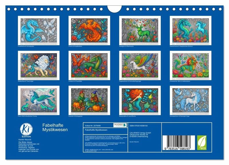 Tauche ein in ein Jahr voller Magie und Fantasie! Dieser außergewöhnliche Kalender präsentiert prachtvolle Fabelwesen und märchenhafte Landschaften, erschaffen mit Hilfe modernster KI-Technologie und künstlerischer Inspiration. Jede Seite zeigt detailreiche Illustrationen, die zum Träumen und Staunen einladen. Lass dich von den einzigartigen Motiven durchs Jahr begleiten - ein Kunstwerk für alle, die das Außergewöhnliche lieben. Entdecke, wie Künstliche Intelligenz und Kreativität gemeinsam neue Welten erschaffen!