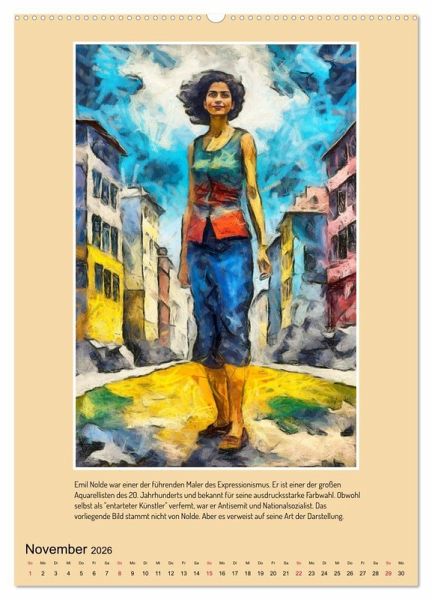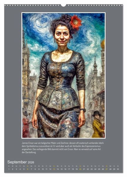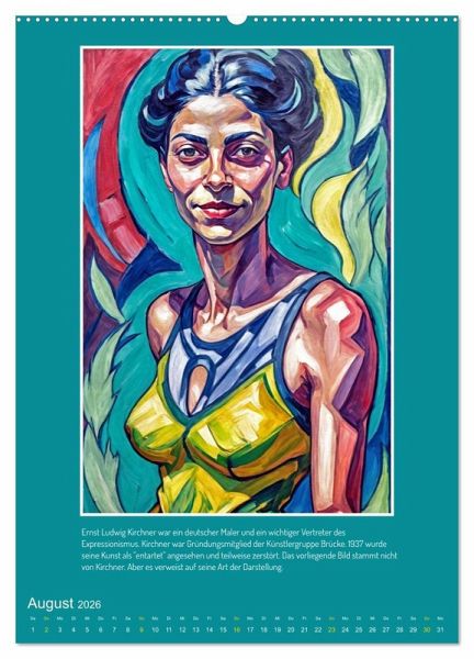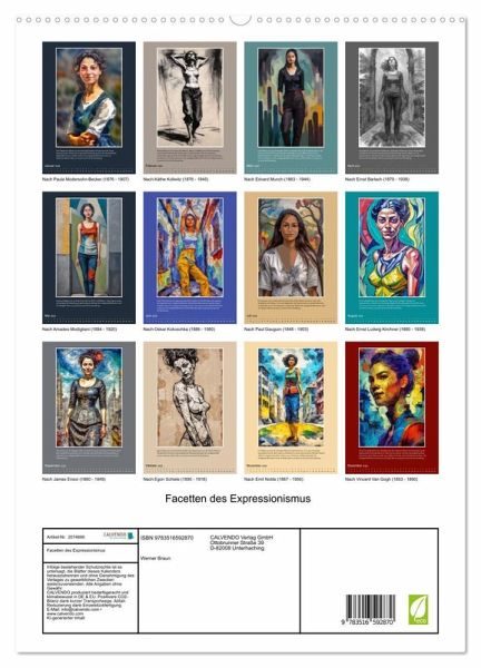Ein Jahr lang in den emotionalen Tiefen des frühen 20. Jahrhunderts: Der Kalender "Facetten des Expressionismus" präsentiert zwölf eindringliche Porträts einer einzigen, von künstlicher Intelligenz erschaffenen Frau, interpretiert durch die Augen bedeutender Künstler und Künstlerinnen dieser Epoche. Von der kraftvollen Menschlichkeit einer Käthe Kollwitz bis zur angstvollen Unruhe von Edvard Munch offenbart jede Monatsseite eine neue Facette des Expressionismus. Lassen Sie sich von der stilistischen Vielfalt inspirieren, die entsteht, wenn der Fokus nicht auf der Realität liegt, sondern auf dem emotionalen Ausdruck. Ein Kaleidoskop der Gefühle, das die revolutionäre Kraft dieser Kunstbewegung in Ihren Alltag bringt.