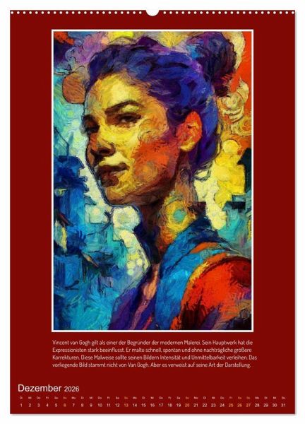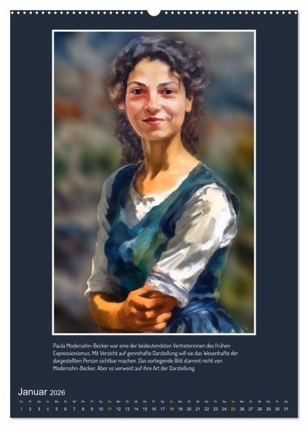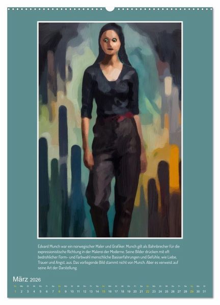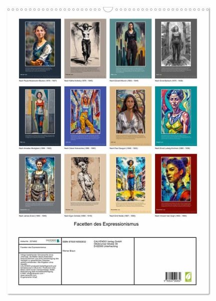Ein Jahr lang in den emotionalen Tiefen des frühen 20. Jahrhunderts: Der Kalender "Facetten des Expressionismus" präsentiert zwölf eindringliche Porträts einer einzigen, von künstlicher Intelligenz erschaffenen Frau, interpretiert durch die Augen bedeutender Künstler und Künstlerinnen dieser Epoche. Von der kraftvollen Menschlichkeit einer Käthe Kollwitz bis zur angstvollen Unruhe von Edvard Munch offenbart jede Monatsseite eine neue Facette des Expressionismus. Lassen Sie sich von der stilistischen Vielfalt inspirieren, die entsteht, wenn der Fokus nicht auf der Realität liegt, sondern auf dem emotionalen Ausdruck. Ein Kaleidoskop der Gefühle, das die revolutionäre Kraft dieser Kunstbewegung in Ihren Alltag bringt.