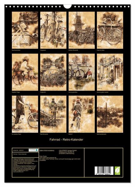 QUALITÄT - Hochwertiger Fotokalender mit 12 wunderschönen Motiven auf lichtbeständigem Bilderdruckpapier, robuste Spiralbindung mit Aufhängebügel.NACHHALTIG - deutliche Abfallreduzierung durch bedarfsgerechte Einzelstückfertigung, umweltfreundliches FSC-zertifiziertes Papier, Produktion in Deutschland, klimabewusste Logistik.PERFEKTES GESCHENK - Kalender für Freunde und Familie, für Kinder und Erwachsene, jung und alt, zu Weihnachten, Geburtstag oder zwischendurch.VIELFALT - Bildkalender in verschiedenen Formaten, z.B. DIN A5, DIN A4, DIN A3 sowie DIN A2. Ob Naturmotiv, Gemälde oder Fotos, ideal für ein persönliches Wohlfühlambiente.Ein Leben ohne Fahrrad, früher und auch heutzutage gar nicht mehr vorstellbar. von Autor(in): Peter Roder