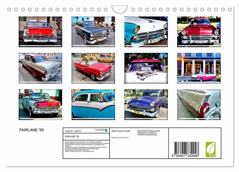 QUALITÄT - Hochwertiger Fotokalender mit 12 wunderschönen Motiven auf lichtbeständigem Bilderdruckpapier, robuste Spiralbindung mit Aufhängebügel.NACHHALTIG - deutliche Abfallreduzierung durch bedarfsgerechte Einzelstückfertigung, umweltfreundliches FSC-zertifiziertes Papier, Produktion in Deutschland, klimabewusste Logistik.PERFEKTES GESCHENK - Kalender für Freunde und Familie, für Kinder und Erwachsene, jung und alt, zu Weihnachten, Geburtstag oder zwischendurch.VIELFALT - Bildkalender in verschiedenen Formaten, z.B. DIN A5, DIN A4, DIN A3 sowie DIN A2. Ob Naturmotiv, Gemälde oder Fotos, ideal für ein persönliches Wohlfühlambiente.Der US-Oldtimer Ford Fairlane aus dem Jahre 1955 von Autor(in): Henning von Loewis of Menar