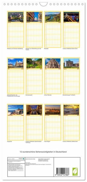 PRAKTISCH - übersichtlicher Familienkalender mit 5 Spalten für bis zu 5 Personen für mehr Struktur im Alltag - so bleiben alle Termine im Blick!ÜBERSICHTLICH - mit farblich getrennten Wochen- und Feiertagen. Die einzelnen Felder bieten genügend Platz für Eintragungen. So macht Organisieren Spaß!FANTASTISCHE BILDER - Dieser Planer ist nicht nur eine nützliche Hilfe im Alltag, sondern schmückt gleichzeitig Ihr Zuhause. Ideal auch als Geschenk.FÜR ALLE STIFTE GEEIGNET - ganz egal, ob Sie lieber mit Kugelschreiber oder Bleistift schreiben.NACHHALTIG - deutliche Abfallreduzierung durch bedarfsgerechte Einzelstückfertigung, umweltfreundliches FSC-zertifiziertes Papier, Produktion in Deutschland, klimabewusste Logistik.Jeden Monat eine beeindruckende Sehenswürdigkeit in Deutschland entdecken. von Autor(in): Peter Roder