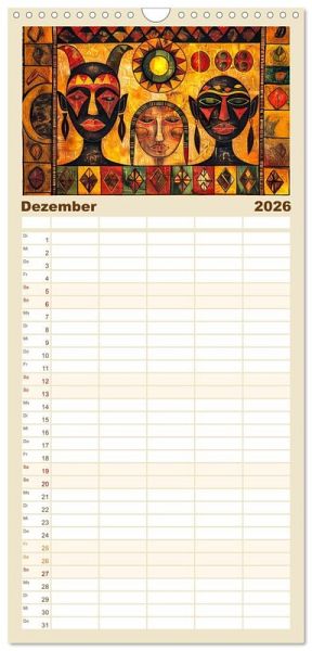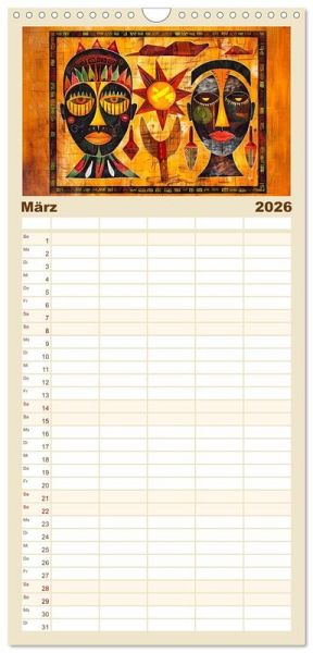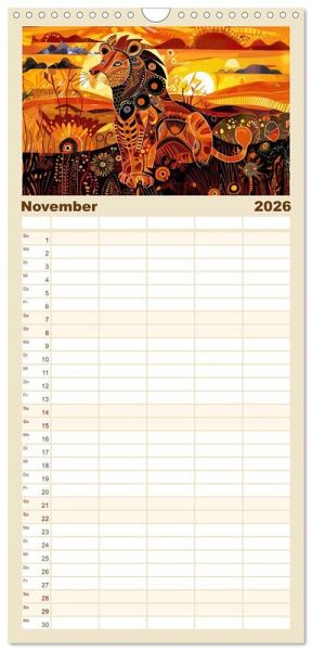 PRAKTISCH - übersichtlicher Familienkalender mit 5 Spalten für bis zu 5 Personen für mehr Struktur im Alltag - so bleiben alle Termine im Blick!ÜBERSICHTLICH - mit farblich getrennten Wochen- und Feiertagen. Die einzelnen Felder bieten genügend Platz für Eintragungen. So macht Organisieren Spaß!FANTASTISCHE BILDER - Dieser Planer ist nicht nur eine nützliche Hilfe im Alltag, sondern schmückt gleichzeitig Ihr Zuhause. Ideal auch als Geschenk.FÜR ALLE STIFTE GEEIGNET - ganz egal, ob Sie lieber mit Kugelschreiber oder Bleistift schreiben.NACHHALTIG - deutliche Abfallreduzierung durch bedarfsgerechte Einzelstückfertigung, umweltfreundliches FSC-zertifiziertes Papier, Produktion in Deutschland, klimabewusste Logistik.Ein Kalender mit expressiven Tiermotiven und afrikanischen Lebenswelten von Autor(in): Anja Frost