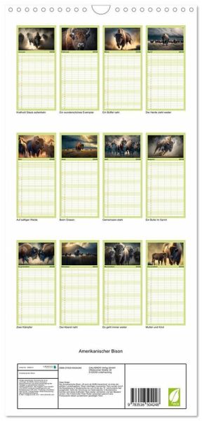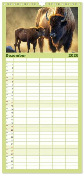 PRAKTISCH - übersichtlicher Familienkalender mit 5 Spalten für bis zu 5 Personen für mehr Struktur im Alltag - so bleiben alle Termine im Blick!ÜBERSICHTLICH - mit farblich getrennten Wochen- und Feiertagen. Die einzelnen Felder bieten genügend Platz für Eintragungen. So macht Organisieren Spaß!FANTASTISCHE BILDER - Dieser Planer ist nicht nur eine nützliche Hilfe im Alltag, sondern schmückt gleichzeitig Ihr Zuhause. Ideal auch als Geschenk.FÜR ALLE STIFTE GEEIGNET - ganz egal, ob Sie lieber mit Kugelschreiber oder Bleistift schreiben.NACHHALTIG - deutliche Abfallreduzierung durch bedarfsgerechte Einzelstückfertigung, umweltfreundliches FSC-zertifiziertes Papier, Produktion in Deutschland, klimabewusste Logistik.DerAmerikanische Bison - seit 2016 Nationaltier der USA von Autor(in): Peter Roder